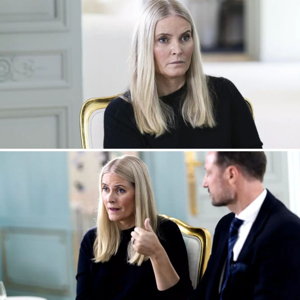 Pinborg beskriver kronprinsessen som «flankert av ektemannen, kronprins Haakon» under intervjuet på Skaugum.